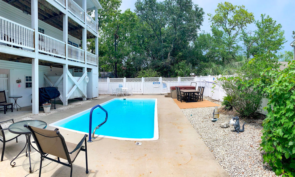 apartment on the ground floor (bedroom, bathroom, full kitchen.) There is a salt-water pool, hot tub, steam room, outdoor shower, and golf cart with complimentary public parking! Four decks run the length of the house, furnished with eco-friendly, amish-made rocking chairs. The game room has foosball, shuffle board, sound system, and a vintage Captain Fantastic pinball machine. You can walk to the beach, or take the golf cart- there is ample free public parking. We provide freshly laundered sheets and towels upon arrival, but there is also a washer and dryer for your convenience. Walk to oceanfront and waterway dining. Beautiful beach and sunsets! Boat docks, fishing pier and docks, golf club, tennis, soccer, basketball, parks, nature center nearby.Warm, vibrant colors and elegant beach decor make this large home the perfect accommodation for your next vacation!